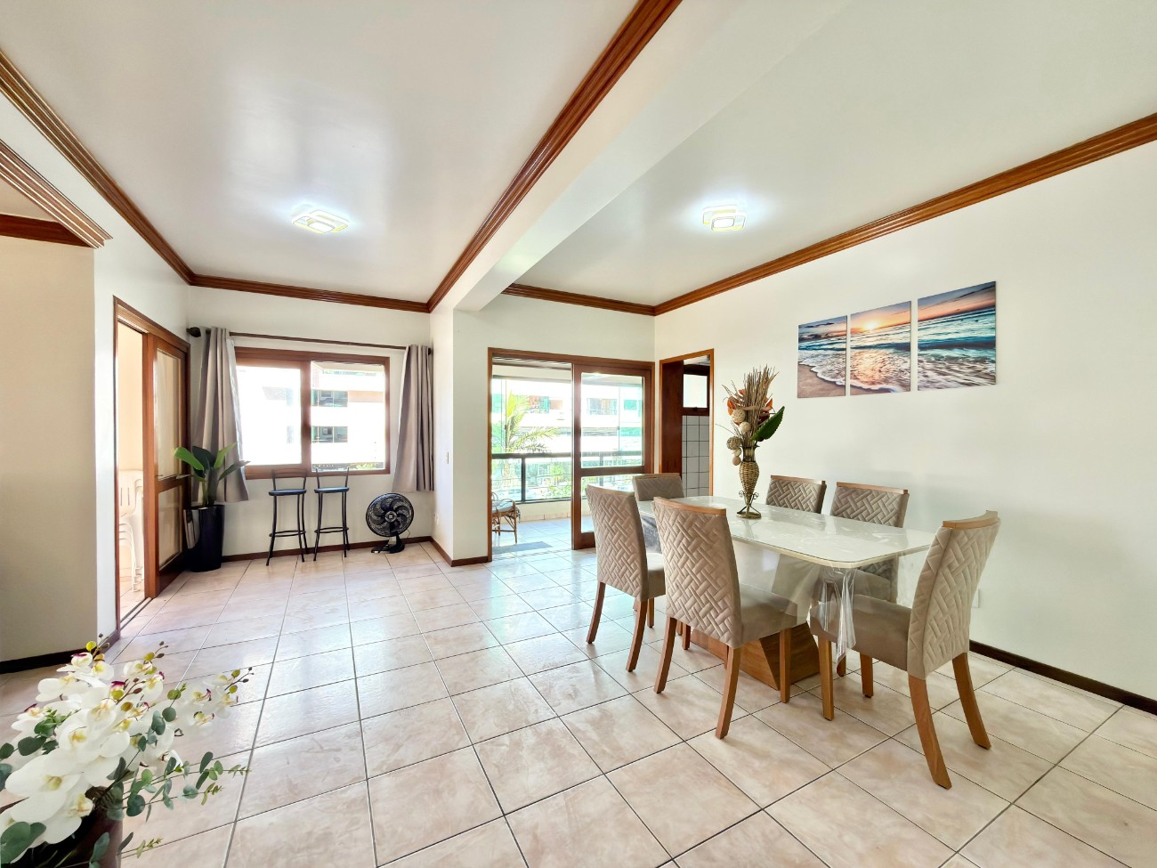 Apartamento à venda em Capão da Canoa, a três quadras do mar. Possui dois dormitórios, sendo uma suíte, dependência de empregada, três banheiros, sala de estar e jantar, cozinha separada, área de serviço, duas sacadas de frente para a avenida com vista para o mar, churrasqueira na sacada e dois terraços, sendo um coberto e outro descoberto. Mobiliado e equipado, com 143 m² de área privativa, além de box de garagem privativo para até três veículos.