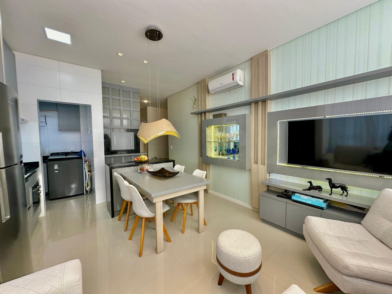 Apartamento à venda no bairro Navegantes, composto por dois dormitórios, sendo uma suíte, e uma vaga de garagem, com 86,53 m² de área total. O imóvel é mobiliado, com splits e eletrodomésticos, possui living integrado com churrasqueira, área de serviço separada, aberturas em PVC e sacada com vista liberada.