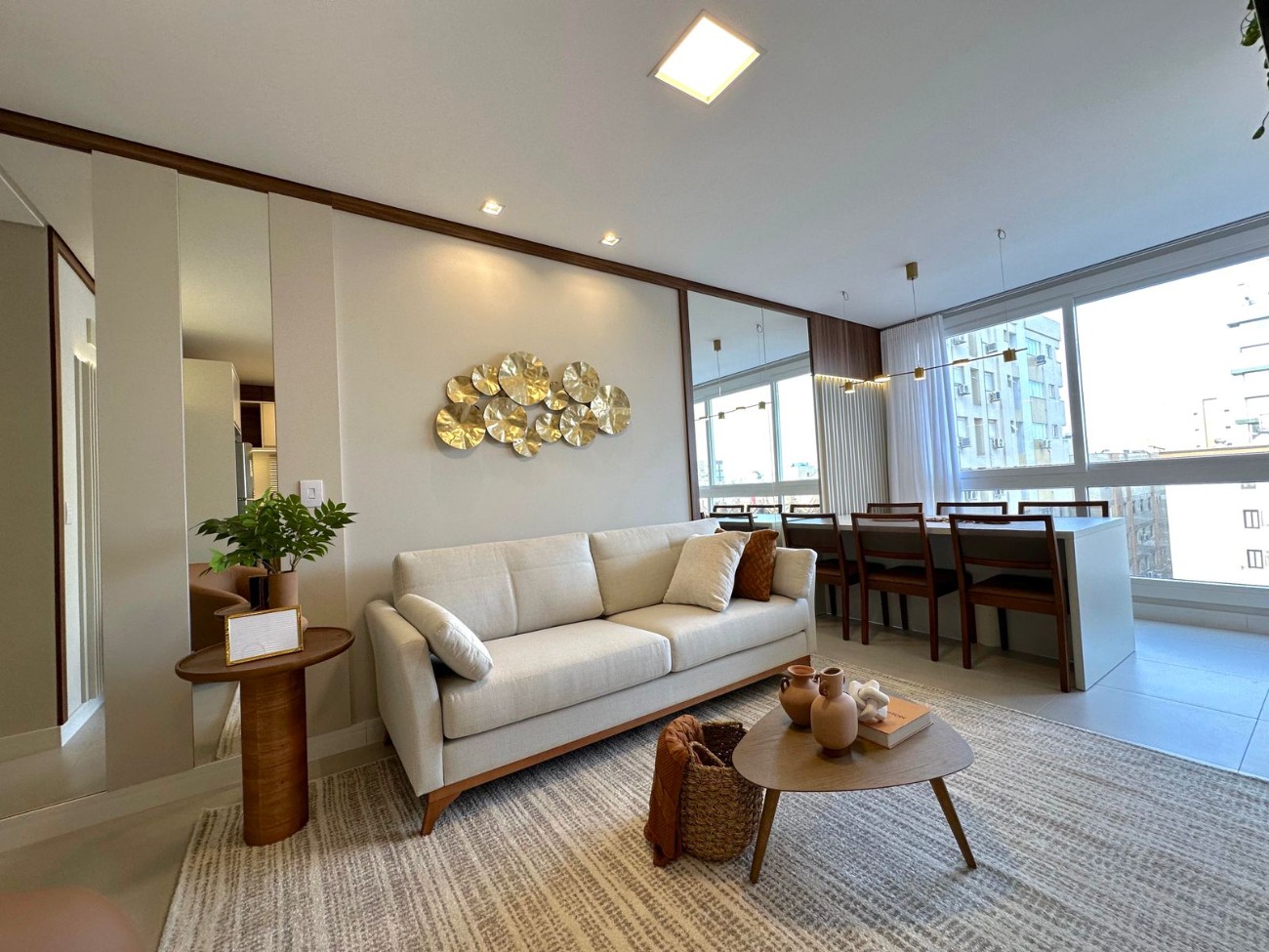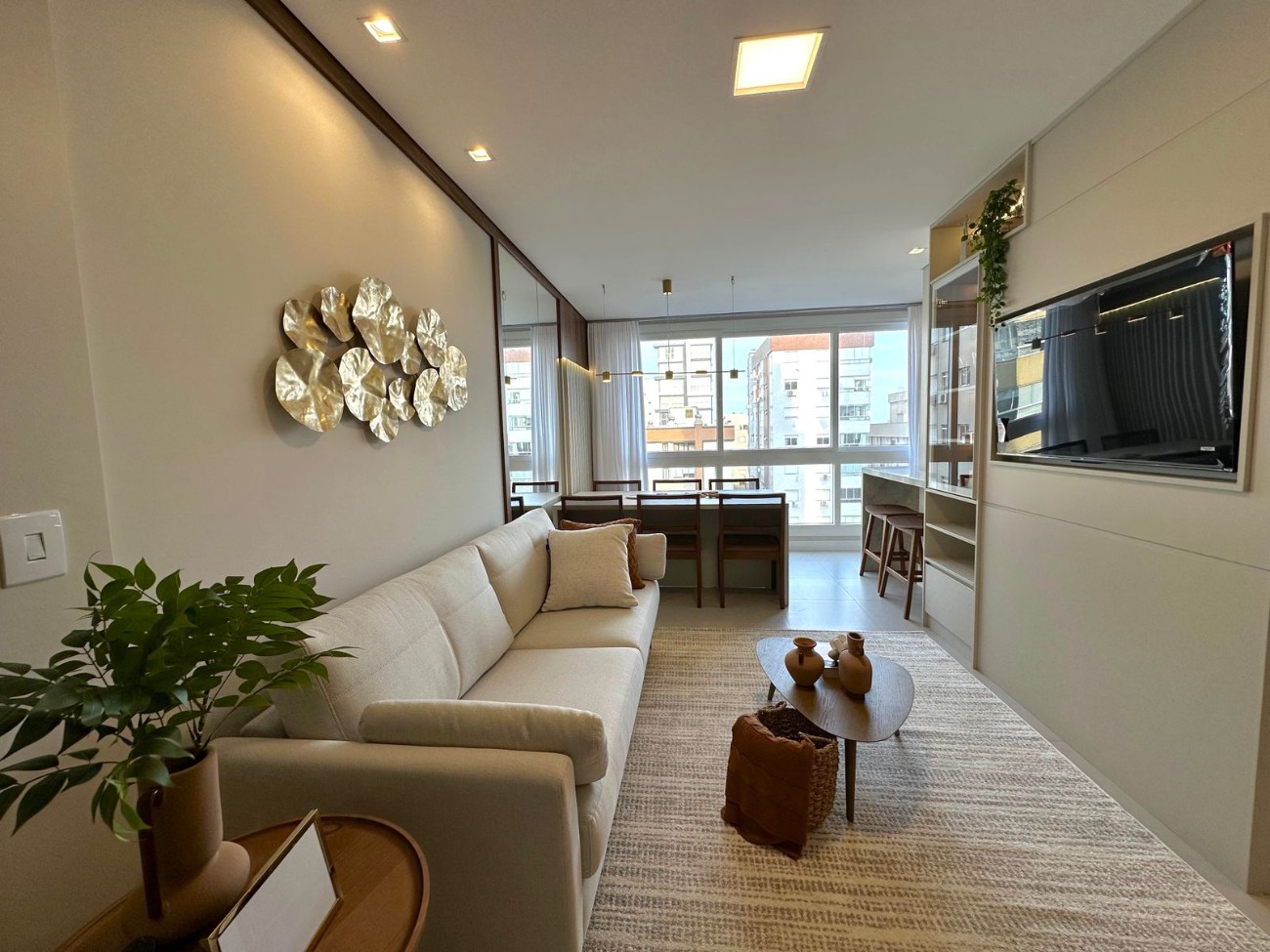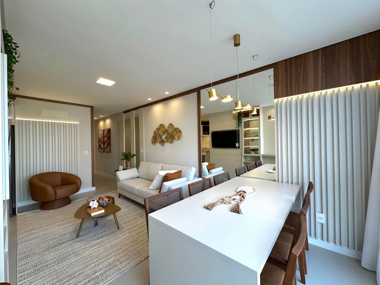 O apartamento encontra-se mobiliado e decorado, apresentando padrão construtivo elevado, com esquadrias em PVC, teto rebaixado em gesso e churrasqueira integrada ao ambiente social, proporcionando funcionalidade e acabamento qualificado.