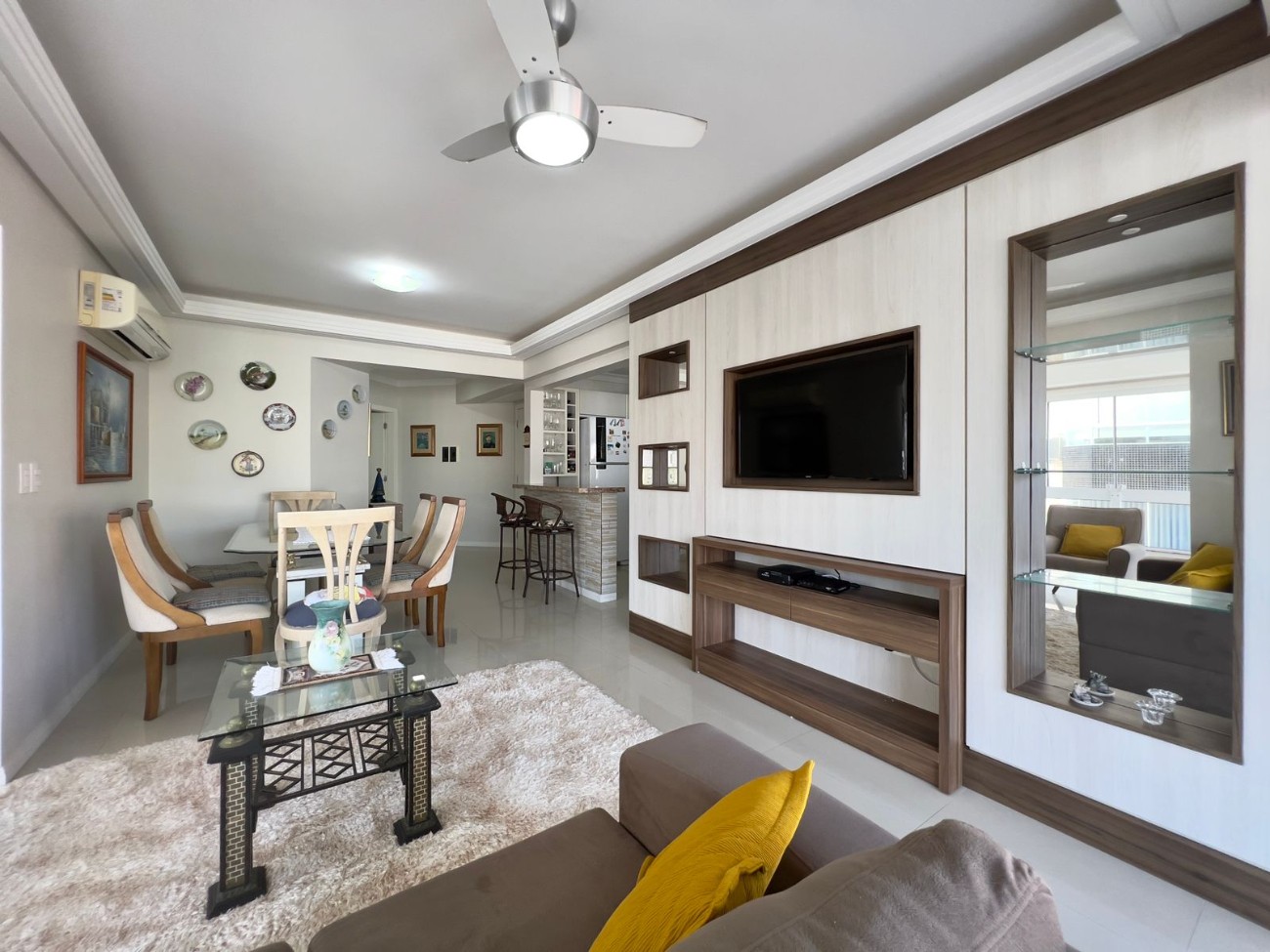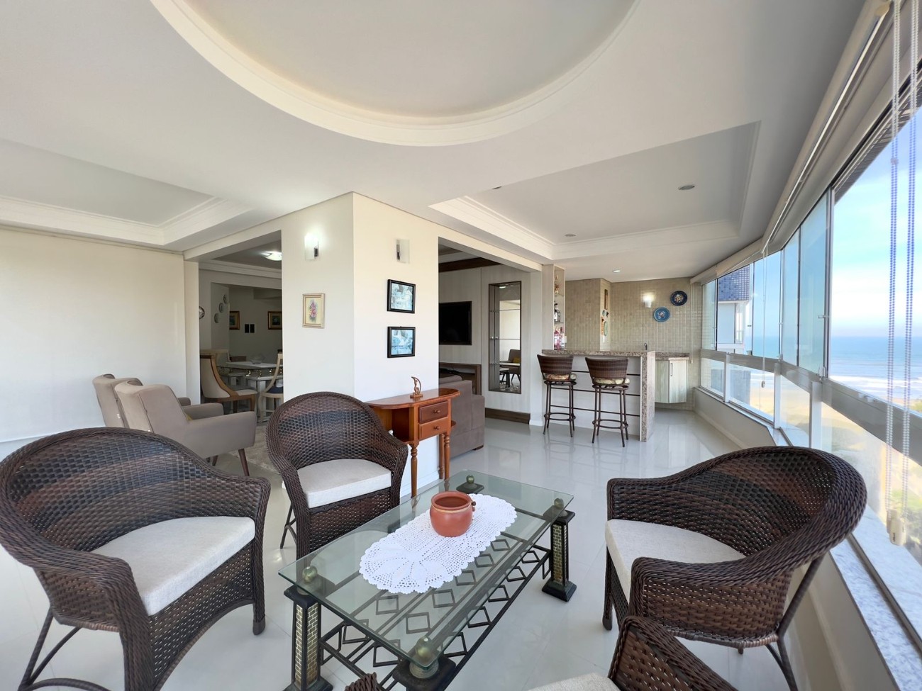 Apartamento à venda no bairro Navegantes, com 118,12m² privativos, três dormitórios, sendo uma suíte, banho social, living integrado de estar e jantar, cozinha com bancada, área de serviço e sacada de frente com vista para o mar. Mobiliado, com churrasqueira, água quente por gás central, split e vaga de estacionamento.