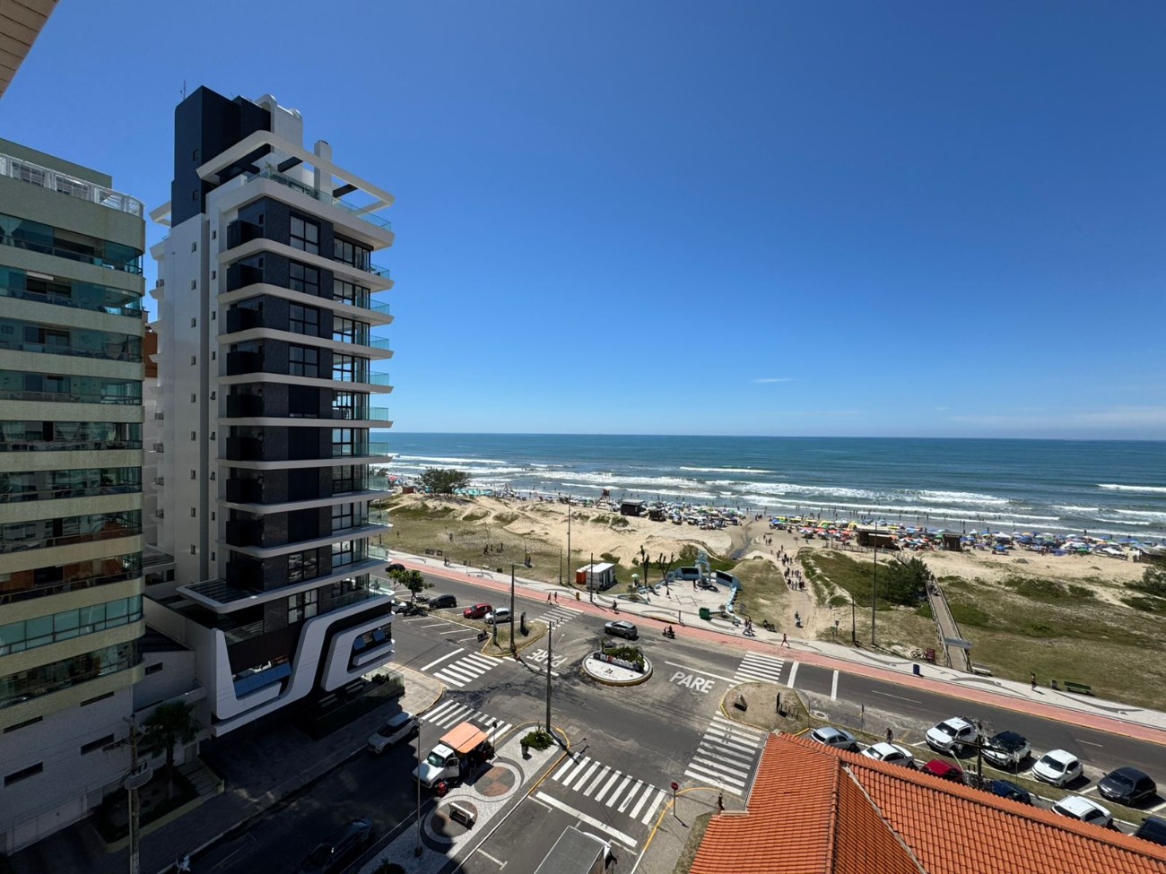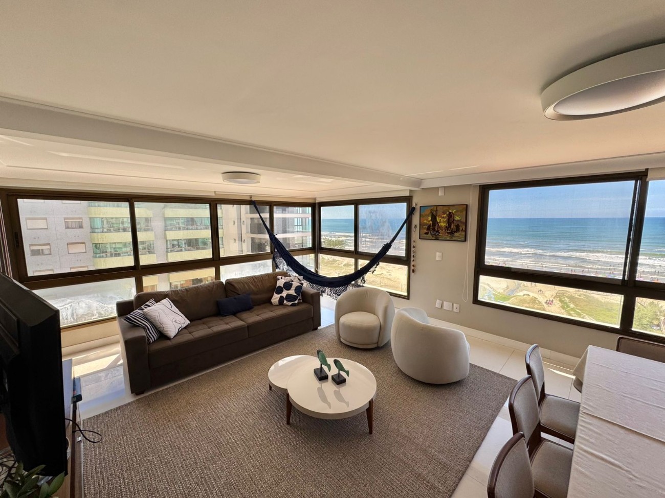 Apartamento à venda no bairro Navegantes, a poucos metros do mar, de frente para avenida, com 248 m² de área total, quatro suítes, living integrado, posição solar Leste/Norte, vista para o mar, aberturas em PVC preto, mobiliado e decorado, com splits em todos os ambientes e eletrodomésticos de primeira linha.