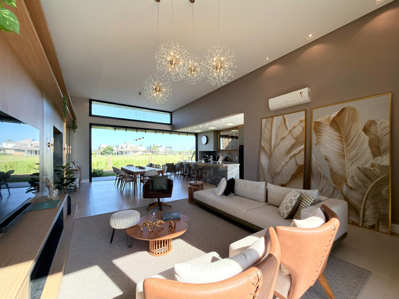 Casa à venda em condomínio fechado, com frente oeste, composta por quatro suítes independentes, lavabo, living em três ambientes, lareira a gás, espaço gourmet, lavanderia, depósito, abrigo para dois veículos e amplo pátio, totalizando 248 m² de área construída.