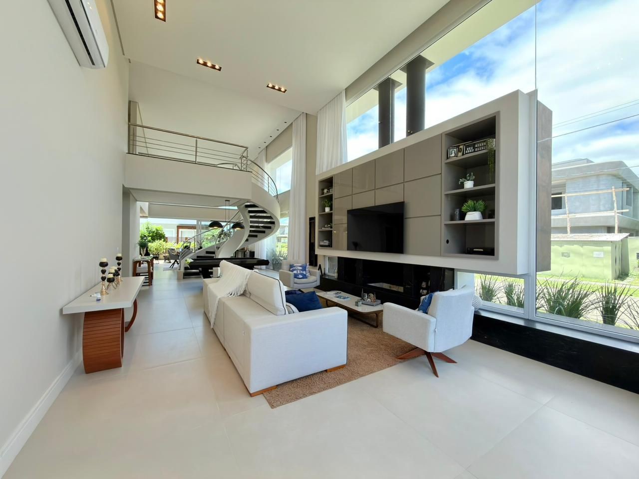 O pavimento social apresenta living amplo em três ambientes, com pé-direito duplo que valoriza a iluminação natural e a integração dos espaços. A cozinha em conceito ilha complementa o ambiente, oferecendo praticidade e design. A residência conta ainda com quatro suítes individuais, garantindo conforto e privacidade, além de estar completamente mobiliada e decorada.