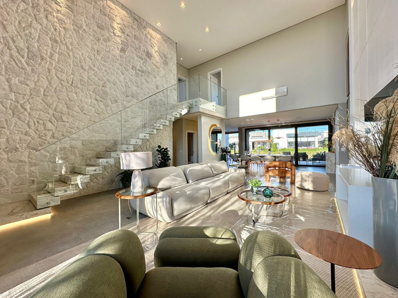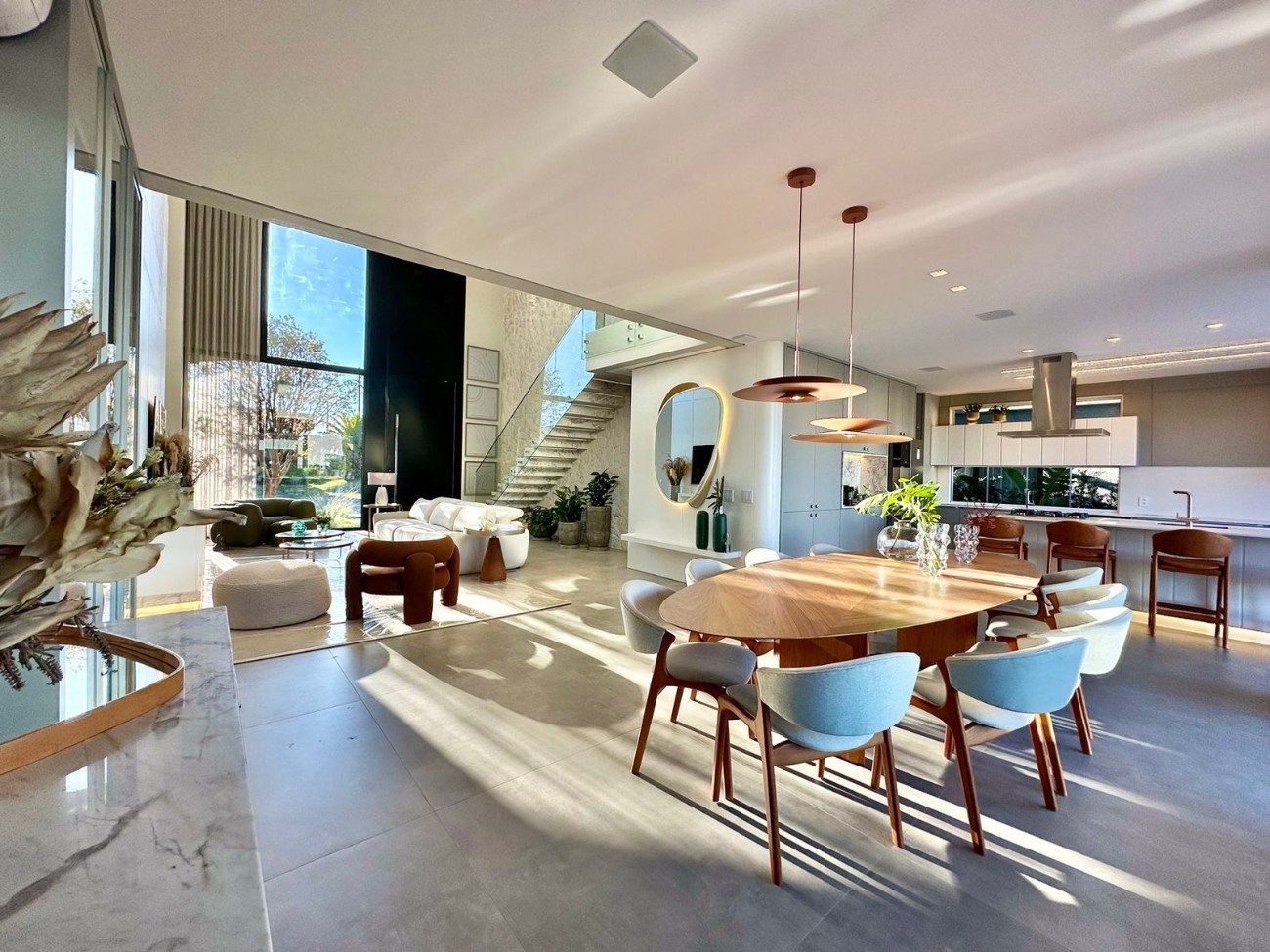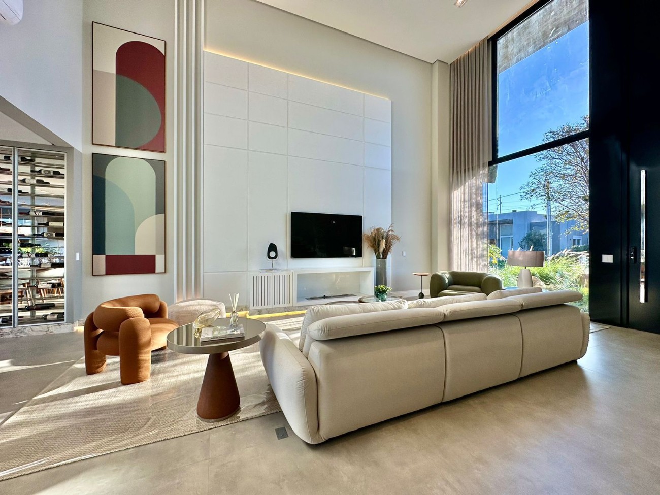 O imóvel possui 293 m² de área construída, distribuídos em quatro suítes, sendo uma térrea e uma suíte master. O living é integrado, com pé-direito duplo, proporcionando boa amplitude e integração dos ambientes. Conta ainda com lavabo, piscina em concreto e sistema de automação residencial. O sobrado é entregue totalmente mobiliado e decorado.