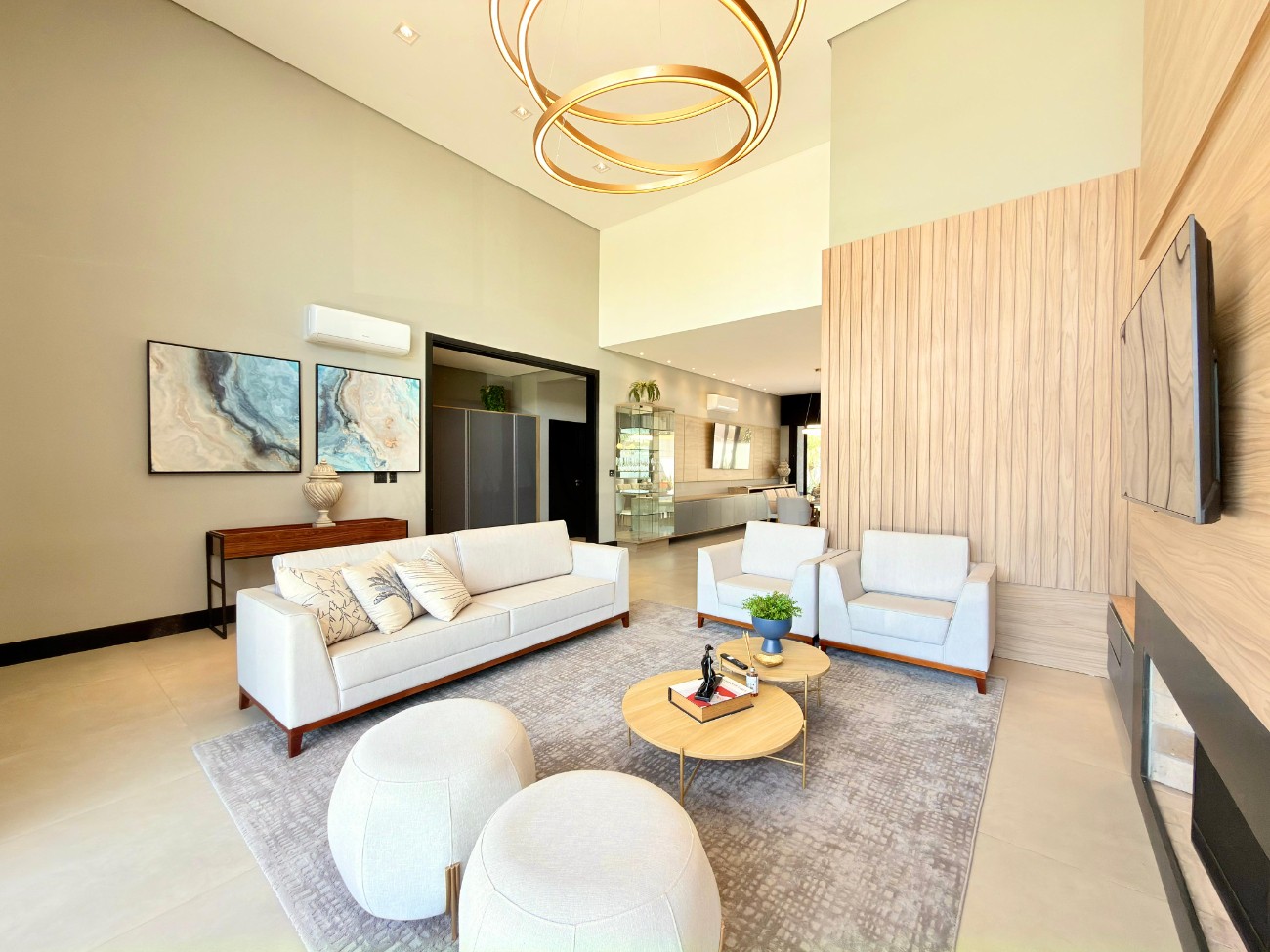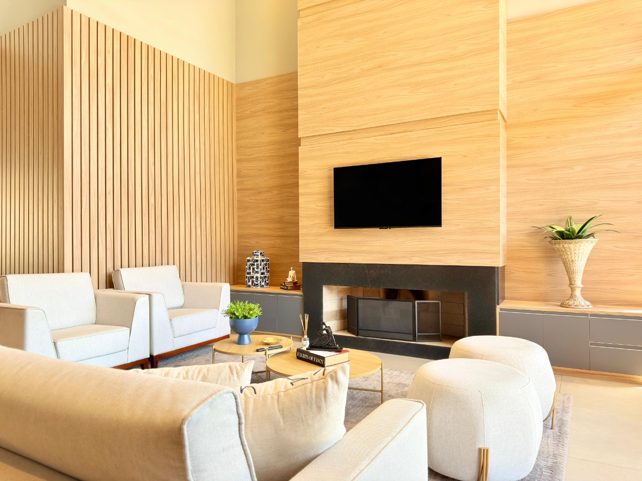 O living possui pé-direito alto e boa incidência de iluminação natural. O imóvel é entregue mobiliado e decorado, contando com persianas automatizadas. A área externa dispõe de pátio e piscina em concreto, integrados à área social.