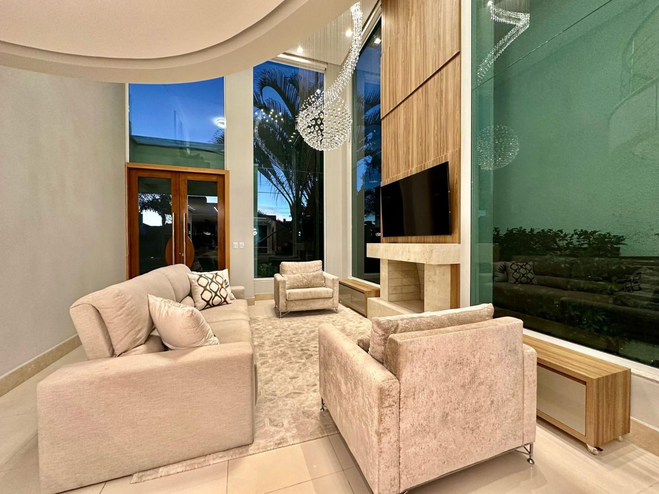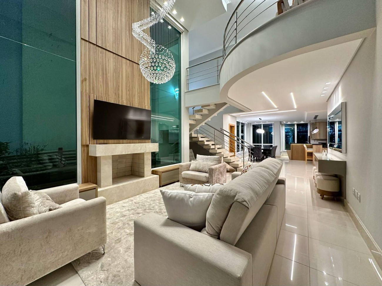Casa à venda em condomínio fechado, composta por quatro suítes individuais, lavabo, living integrado em dois ambientes com pé-direito duplo, lareira, churrasqueira integrada e piscina nos fundos. O imóvel encontra-se mobiliado e decorado, contando com eletrodomésticos e splits instalados em todos os ambientes, além de acabamentos em gesso no teto e esquadrias em PVC.