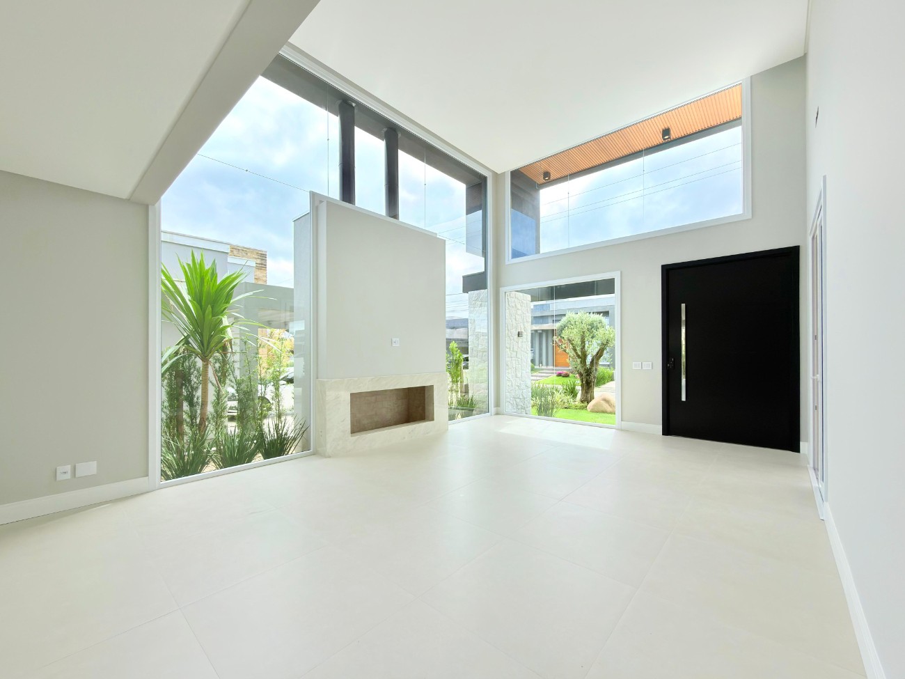 Conta com lareira revestida em mármore, churrasqueira com espera para bifeteira, varanda com pergolado e forro 100% rebaixado em gesso. As aberturas são em PVC com automação, a fachada possui iluminação funcional e o paisagismo inclui iluminação e sistema de irrigação automatizada no jardim. Há esperas para ar-condicionado split e utilização de pedras naturais nos revestimentos especificados.