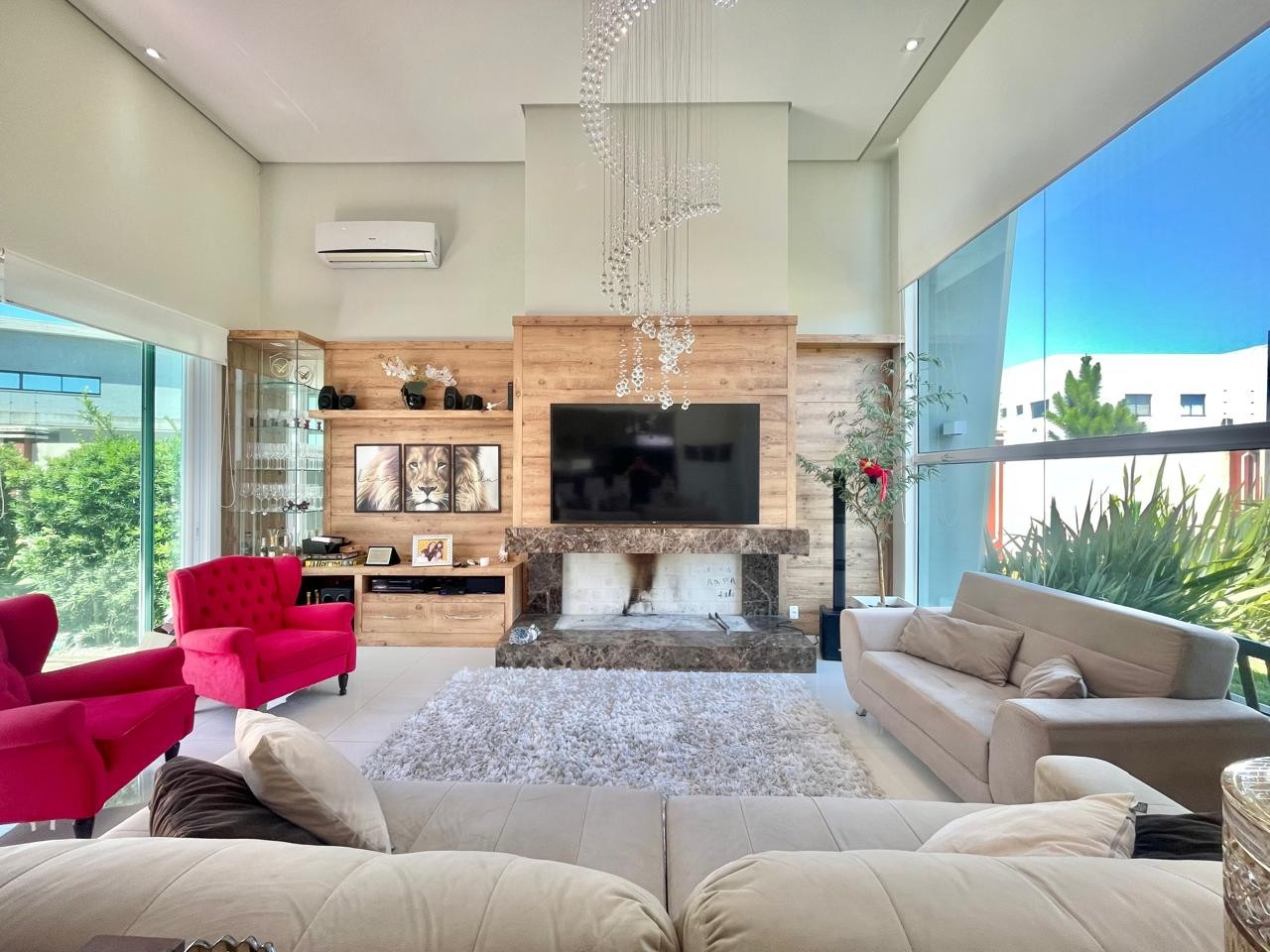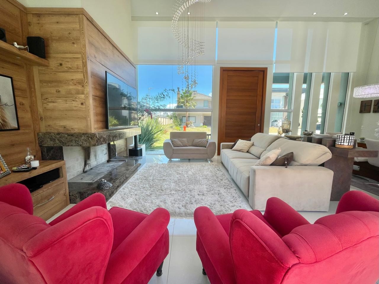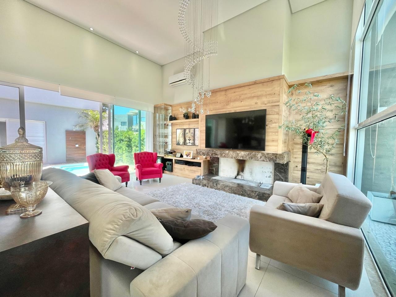 A residência encontra-se mobiliada e decorada, contando com persianas automatizadas e piscina integrada ao projeto.