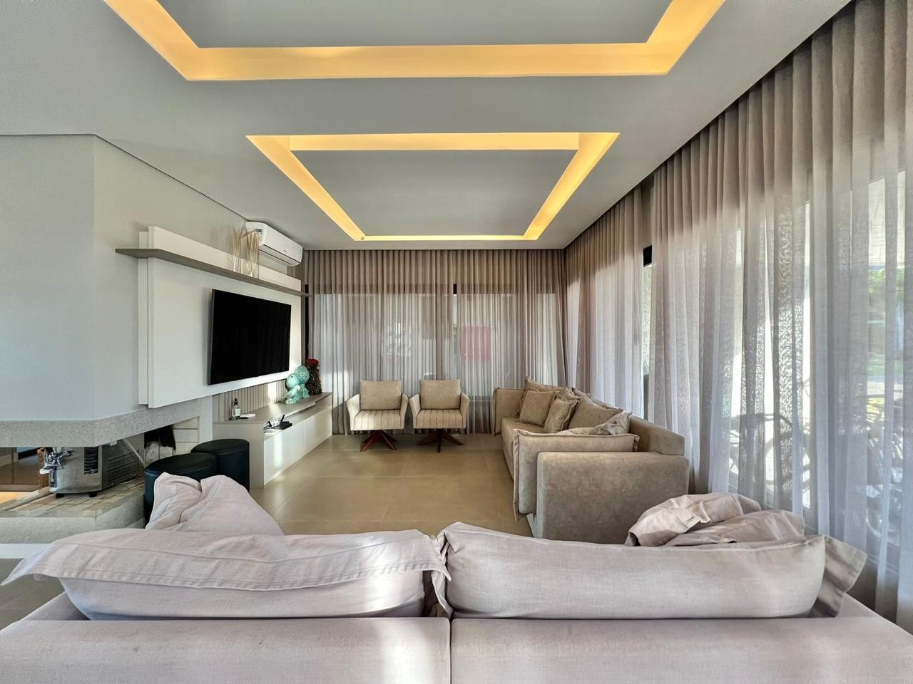 Sobrado à venda em condomínio fechado, com 320 m² de área privativa, composto por cinco dormitórios, sendo quatro suítes, lavabo e piscina. Possui eletrodomésticos de última geração e splits em todos os ambientes.