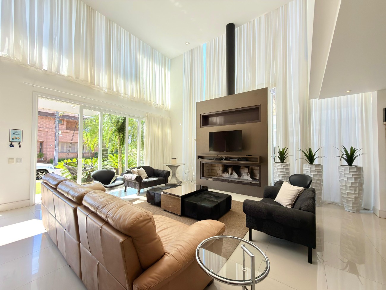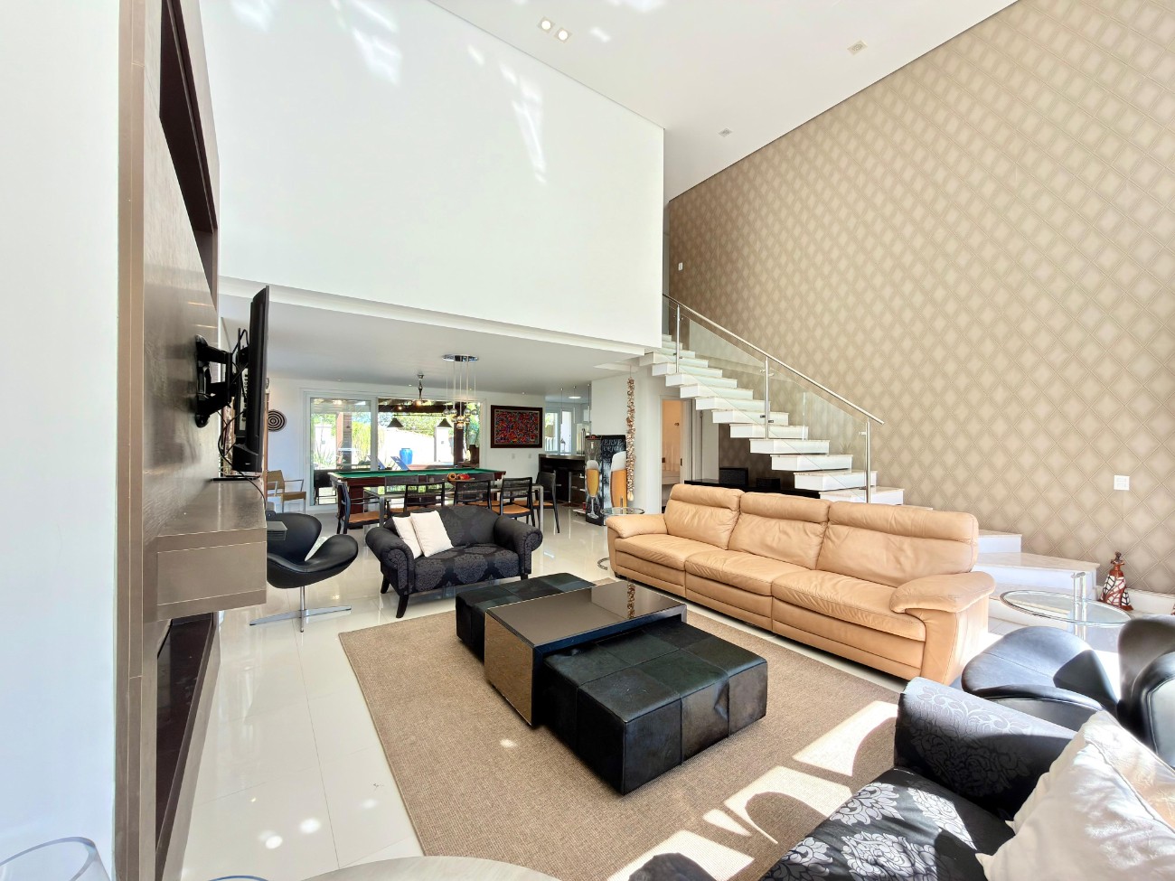 A área externa é composta por deck com piscina, fogão a lenha, churrasqueira em aço inox giratória com fogareiro e paisagismo. O projeto arquitetônico contempla ventilação e iluminação natural em todos os ambientes. O imóvel conta ainda com móveis sob medida, climatização em todas as suítes, aberturas em PVC branco automatizadas com telas mosquiteiro e garagem com capacidade para quatro veículos, sendo duas vagas cobertas. O muro possui revestimento em porcelanato perfilado.