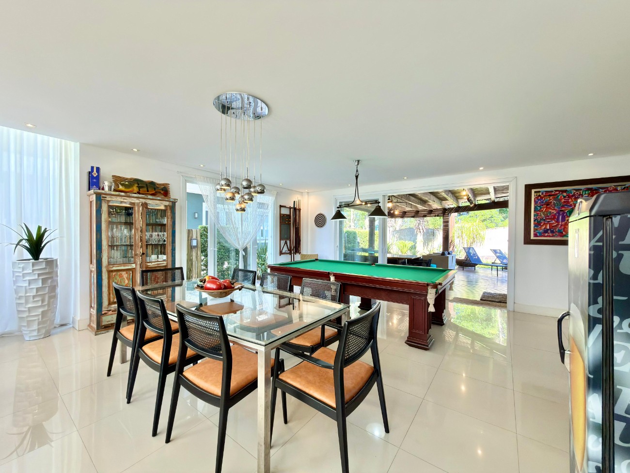 Sobrado à venda no condomínio Porto Coronado, localizado em Xangri-lá, Atlântida. O imóvel possui aproximadamente 330 m² de área construída e encontra-se mobiliado. A composição inclui cinco suítes, sendo uma suíte master com closet e hidromassagem, lavabo, living com pé-direito duplo e lareira, cozinha gourmet, área de serviço e espaço destinado a jogos e convivência.
