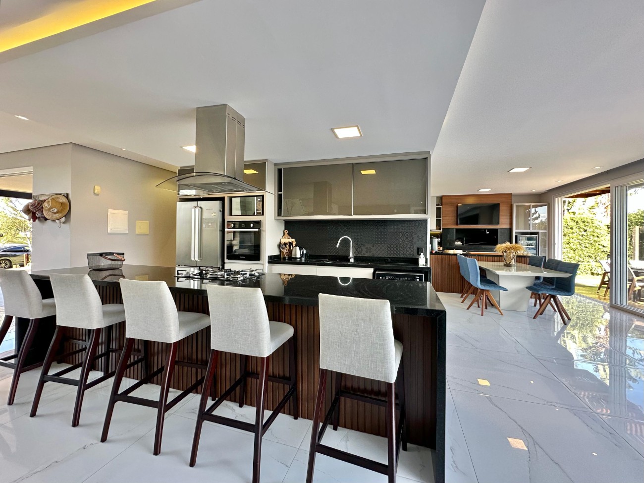 O projeto contempla living com quatro ambientes integrados, espaço gourmet com churrasqueira, lavabo, área de serviço e ambientes totalmente mobiliados e decorados. A residência conta ainda com climatização completa, persianas automatizadas e piscina em concreto com borda infinita, atendendo a um padrão construtivo elevado e funcional.