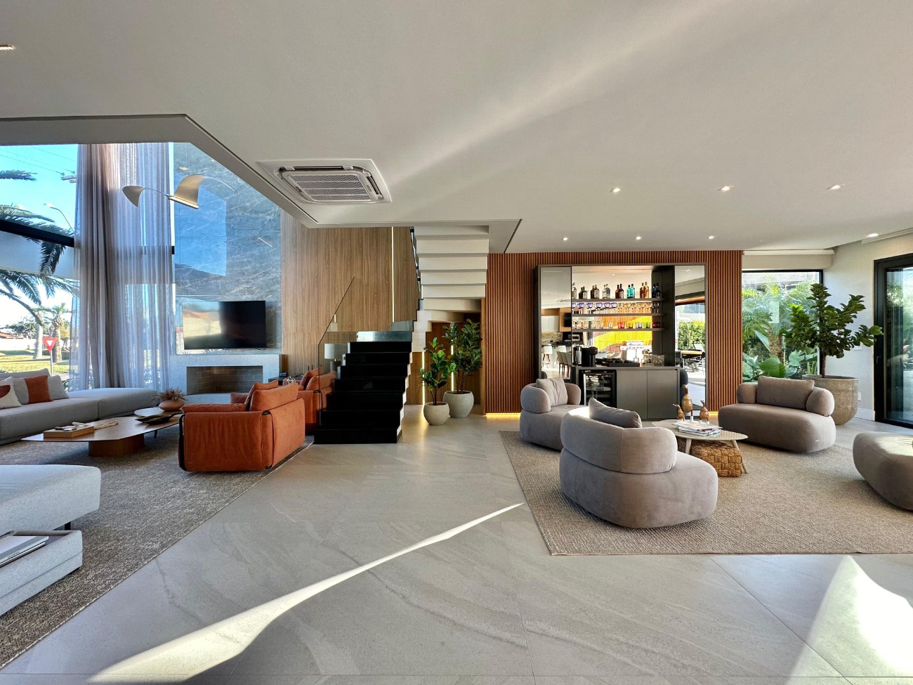 A residência é entregue completamente mobiliada e decorada, com padrão construtivo elevado, elevador interno e automação parcial de iluminação. Conta ainda com paisagismo com irrigação automática, piscina em concreto com aquecimento e tratamento por sal, além de pergolado com 42 m² integrado à área externa. Implantação à beira do lago, com vista aberta e integração com o entorno.